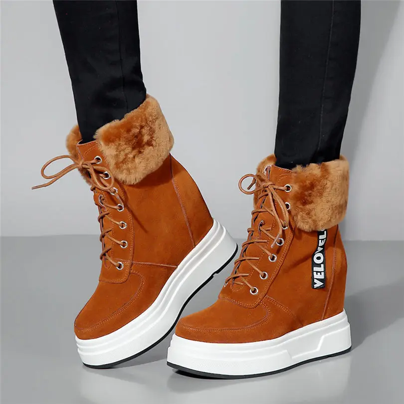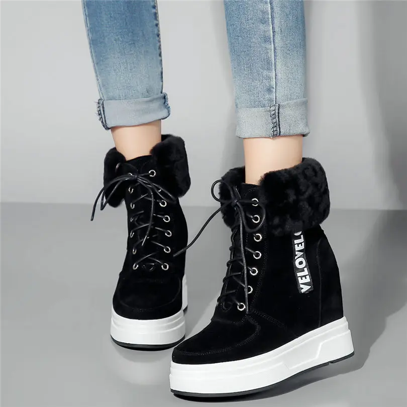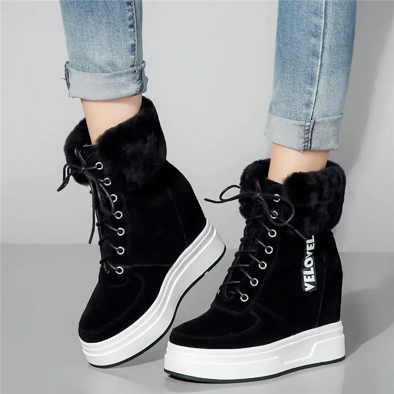 Lace Up Creepers Trainers Shoes Women Cow Leather High Heel Ankle Boots Wedges Platform Rabbit Fur